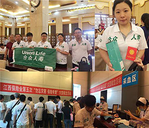 合众人寿江西分公司在7·8全国保险公众宣传日系列活动之江西保险业第五次“勿忘灾害 保险有爱”大型献血活动中积极参与献血活动,对灾区人民贡献出自己的一颗真心,为献血略尽绵薄之力,传递真善美,共筑幸福生活。